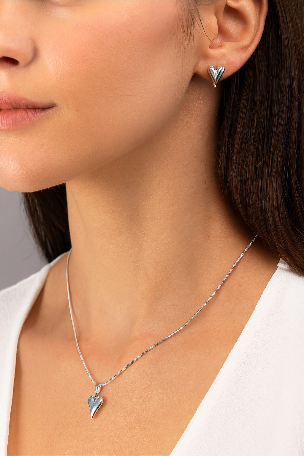 The Siobhan Set combines a delicate silver heart pendant on a sleek chain with matching heart-shaped stud earrings, creating a harmonious and elegant look. Perfect for adding a touch of romance and sophistication to any outfit, this set is ideal for both everyday wear and special occasions. Gift the Siobhan Set to someone special or treat yourself to timeless elegance that speaks from the heart.