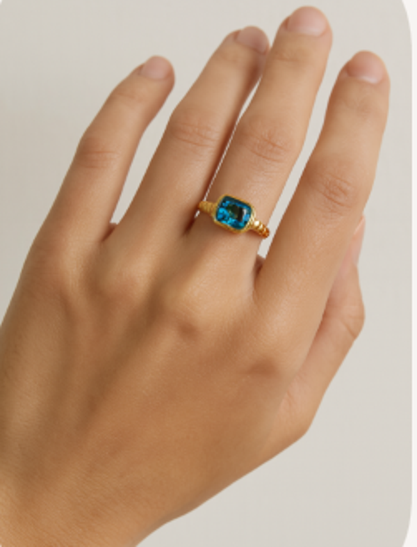 Elevate your elegance with the Destiny ring, featuring a stunning blue topaz stone set in a gracefully twisted gold band. This exquisite design captures light beautifully, adding a touch of sophistication to any outfit. Perfect for those who appreciate timeless style with a modern twist, Destiny promises to be a cherished addition to your jewelry collection.