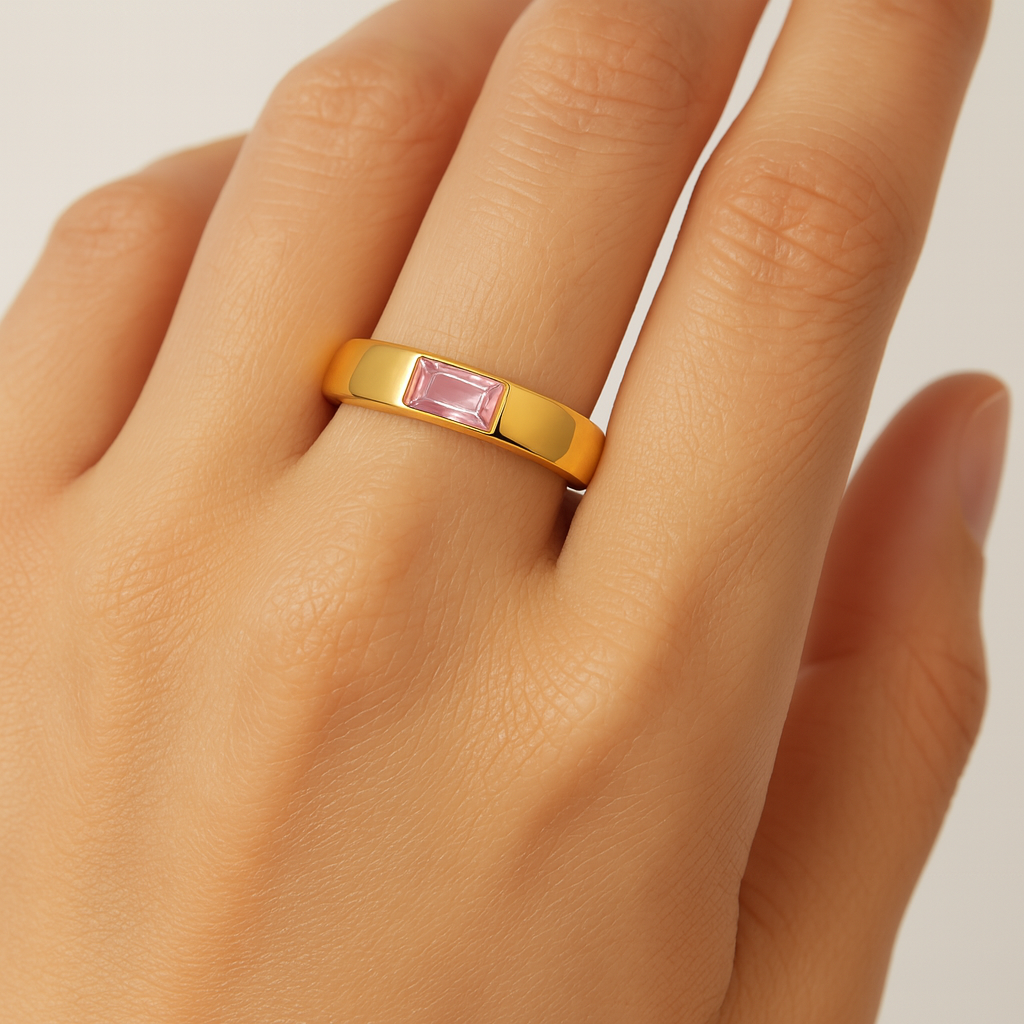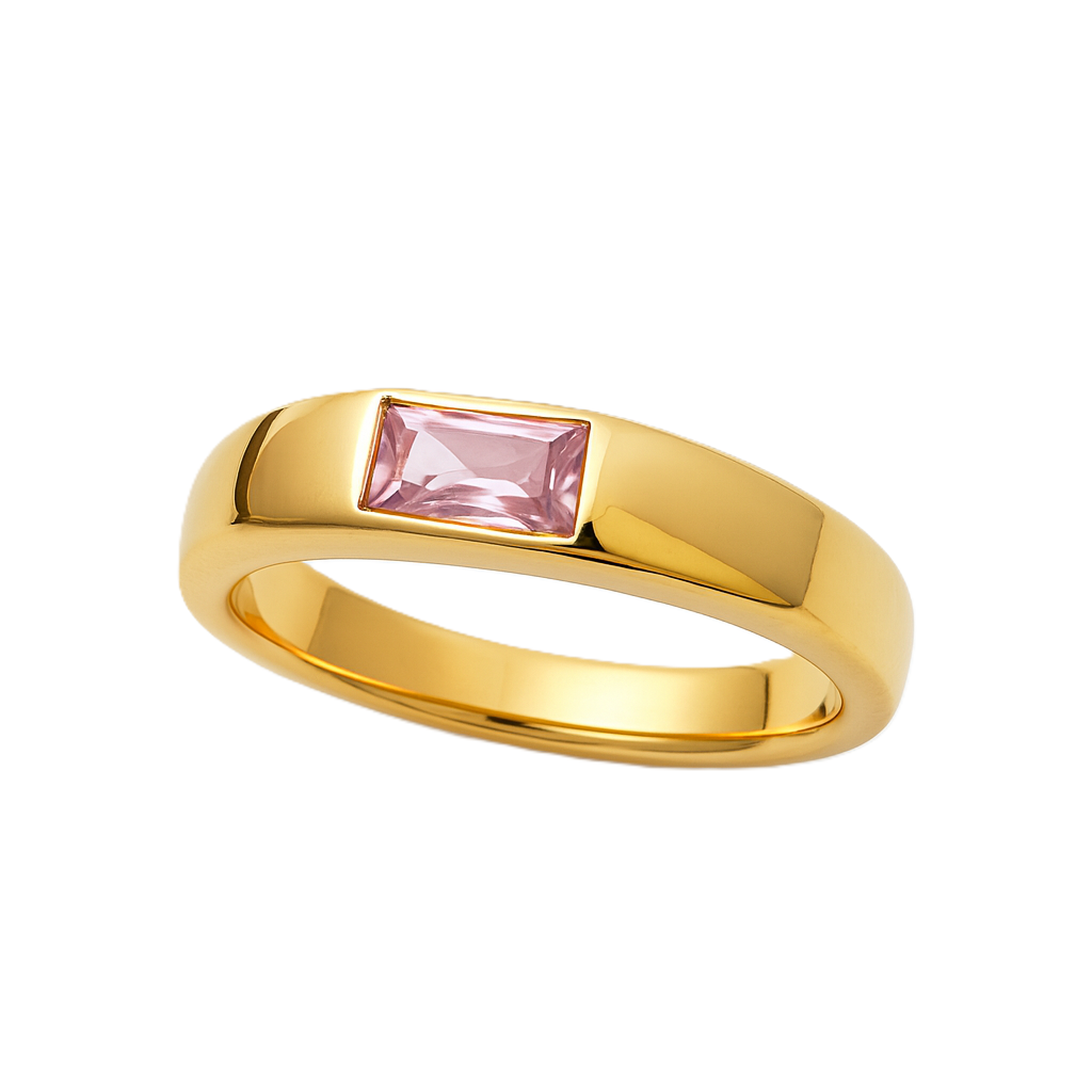 The Shanice Ring showcases a charming square pale pink diamante elegantly set in a simple band. Its refined design brings a gentle sparkle and a touch of soft color, making it an ideal accessory to enhance any outfit with understated sophistication. Perfect for adding a subtle yet captivating detail to your everyday look or special moments.
