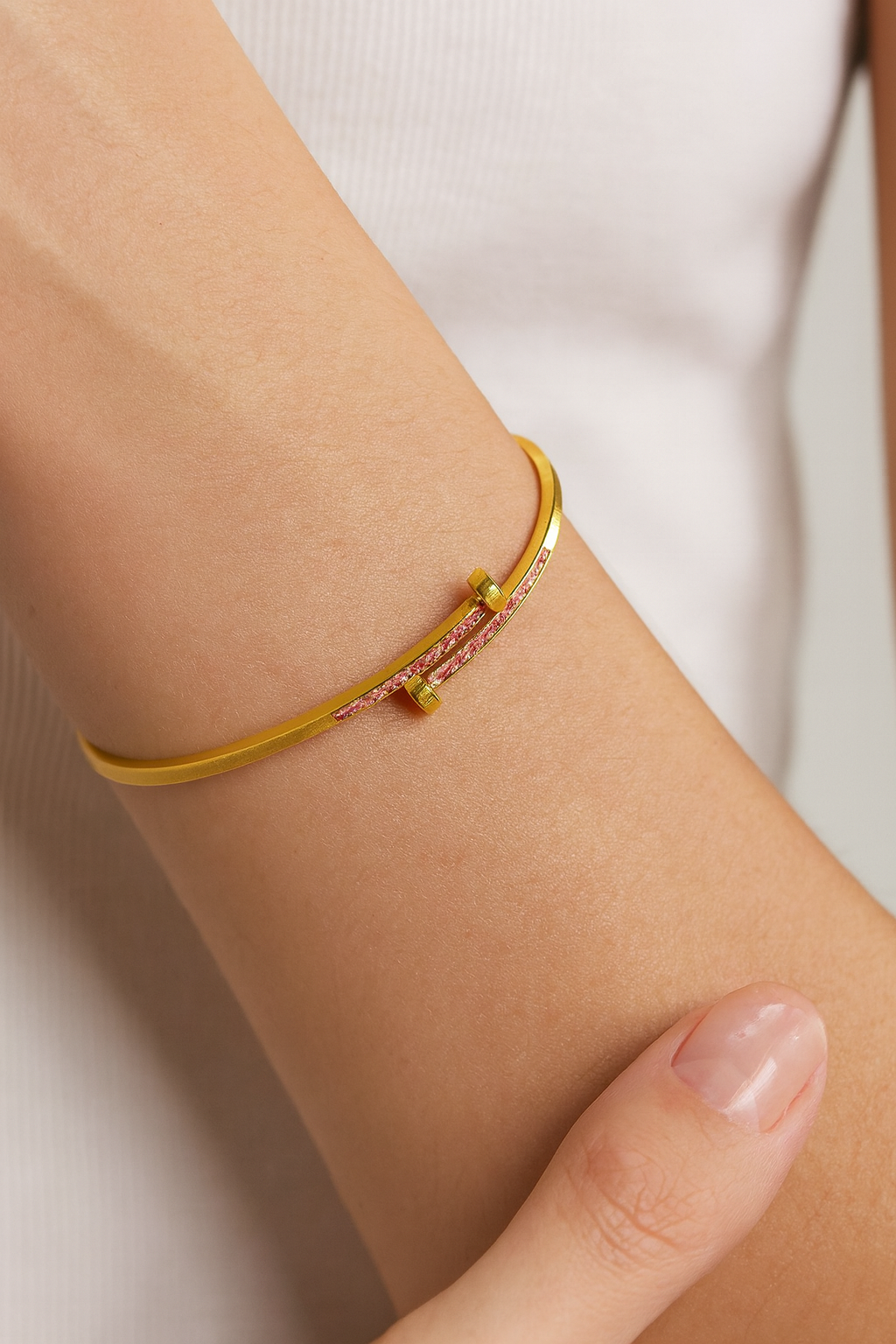 Introducing the OLIVIA NAIL BRACELET, a unique and chic accessory designed to resemble a nail with a stunning row of pink cubic zirconia's. This eye-catching bangle will elevate any outfit and add a touch of elegance and sophistication. Perfect for those looking to make a bold statement with their jewellery.