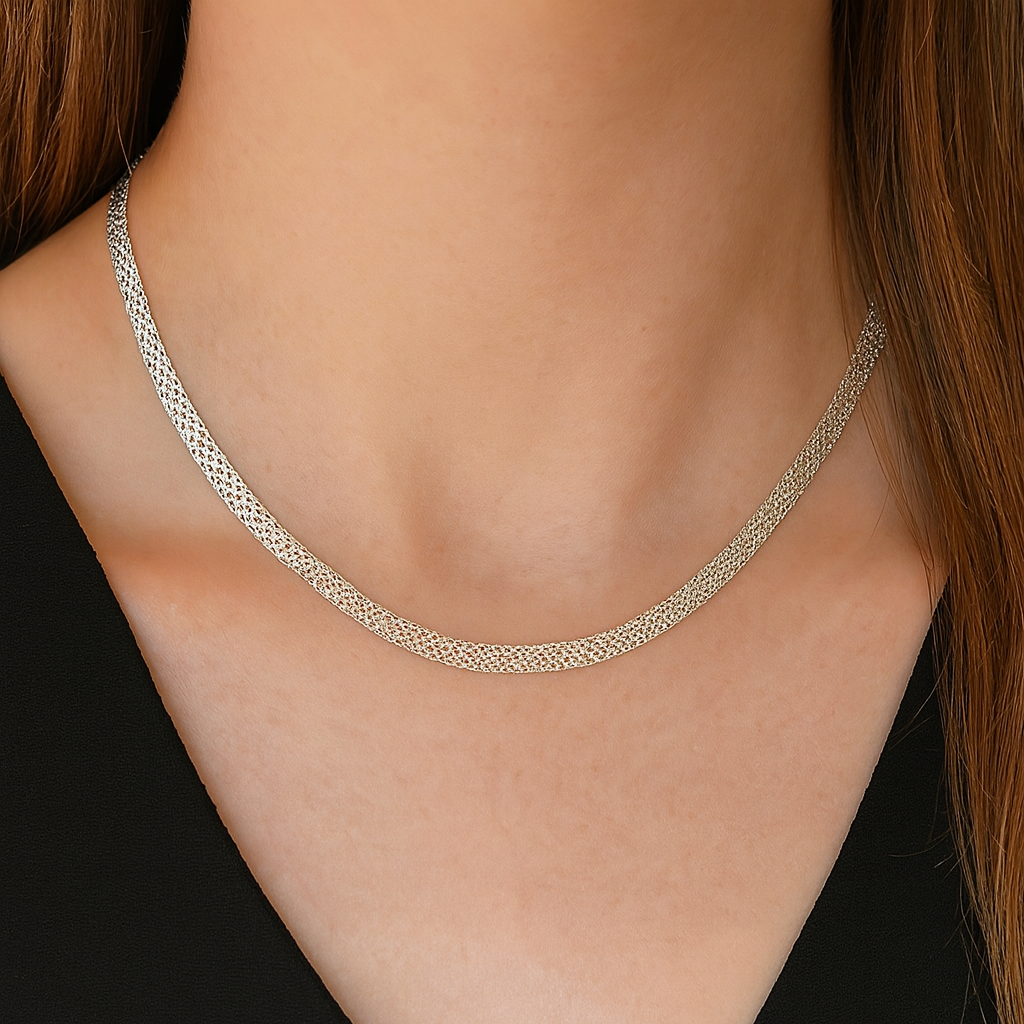 Elevate your everyday elegance with this sterling silver woven chain necklace. Featuring a flat, intricately braided design, it catches the light with every movement, adding a subtle shimmer to your neckline.
