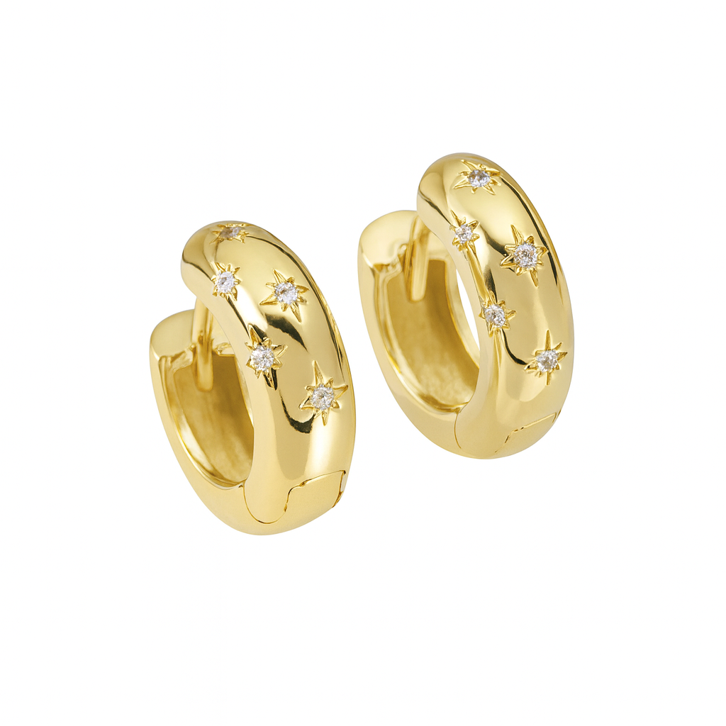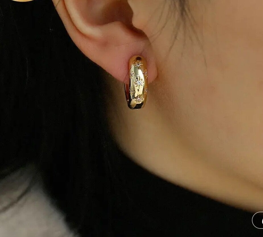 Gold hoops dotted with sparkling star‑set stones, designed for everyday shine. Waterproof, tarnish‑resistant, and hypoallergenic, they’re lightweight, comfortable, and perfect for effortless stacking or a simple statement.